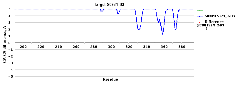 | Red line = (blue line) - (green thick line): difference between the corresponding "Assisted Model"-Target and "Regular Model"-Target CA-CA distances (see above). Negative values show regions where the "assisted" model has better fit to the target than the reference model, i.e. areas of potential improvement. |