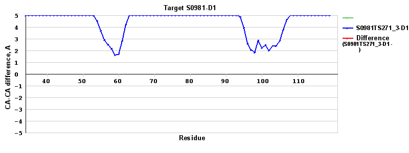 Red line = (blue line) - (green thick line): difference between the corresponding "Assisted Model"-Target and "Regular Model"-Target CA-CA distances (see above). Negative values show regions where the "assisted" model has better fit to the target than the reference model, i.e. areas of potential improvement.