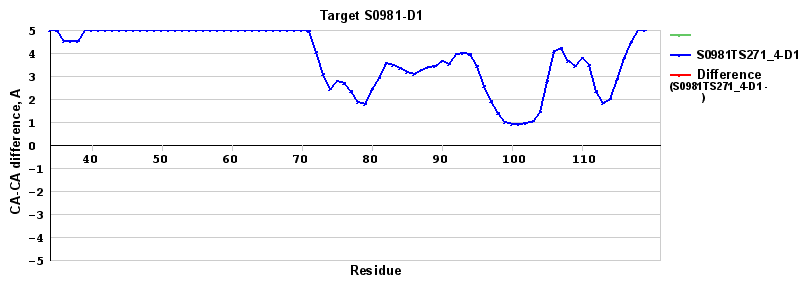| Blue line: distance between the corresponding CA atoms in a "assisted model" and the experimental structure in the LGA sequence-independent superposition under the 4A distance cutoff. |