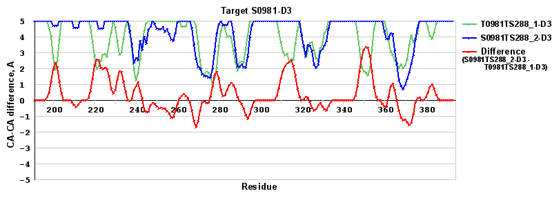 | Red line = (blue line) - (green thick line): difference between the corresponding "Assisted Model"-Target and "Regular Model"-Target CA-CA distances (see above). Negative values show regions where the "assisted" model has better fit to the target than the reference model, i.e. areas of potential improvement. |