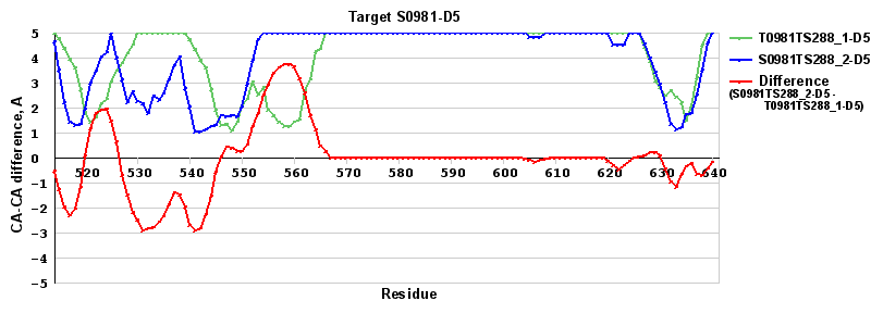 | Red line = (blue line) - (green thick line): difference between the corresponding "Assisted Model"-Target and "Regular Model"-Target CA-CA distances (see above). Negative values show regions where the "assisted" model has better fit to the target than the reference model, i.e. areas of potential improvement. |
