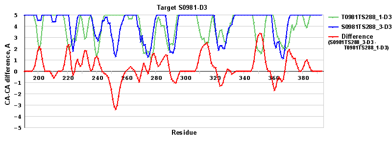 | Red line = (blue line) - (green thick line): difference between the corresponding "Assisted Model"-Target and "Regular Model"-Target CA-CA distances (see above). Negative values show regions where the "assisted" model has better fit to the target than the reference model, i.e. areas of potential improvement. |