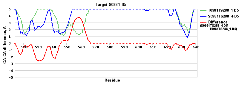 | Red line = (blue line) - (green thick line): difference between the corresponding "Assisted Model"-Target and "Regular Model"-Target CA-CA distances (see above). Negative values show regions where the "assisted" model has better fit to the target than the reference model, i.e. areas of potential improvement. |