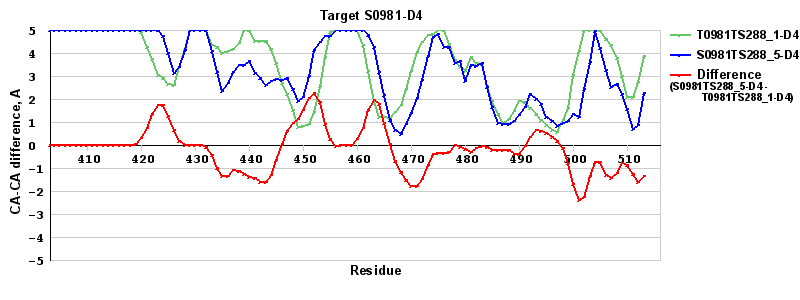 | Red line = (blue line) - (green thick line): difference between the corresponding "Assisted Model"-Target and "Regular Model"-Target CA-CA distances (see above). Negative values show regions where the "assisted" model has better fit to the target than the reference model, i.e. areas of potential improvement. |