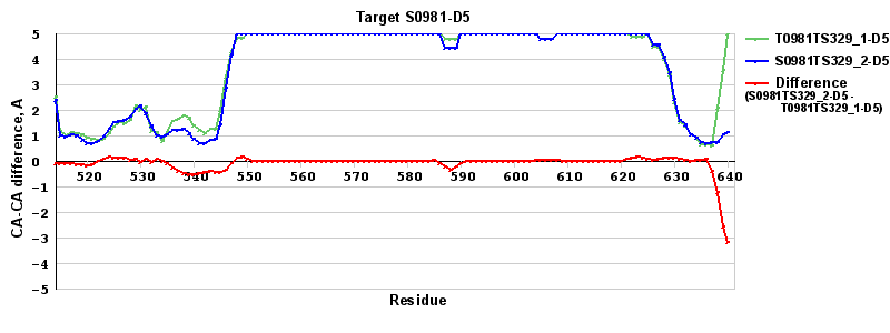 Red line = (blue line) - (green thick line): difference between the corresponding "Assisted Model"-Target and "Regular Model"-Target CA-CA distances (see above). Negative values show regions where the "assisted" model has better fit to the target than the reference model, i.e. areas of potential improvement.