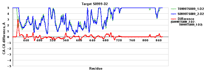 Red line = (blue line) - (green thick line): difference between the corresponding "Assisted Model"-Target and "Regular Model"-Target CA-CA distances (see above). Negative values show regions where the "assisted" model has better fit to the target than the reference model, i.e. areas of potential improvement.
