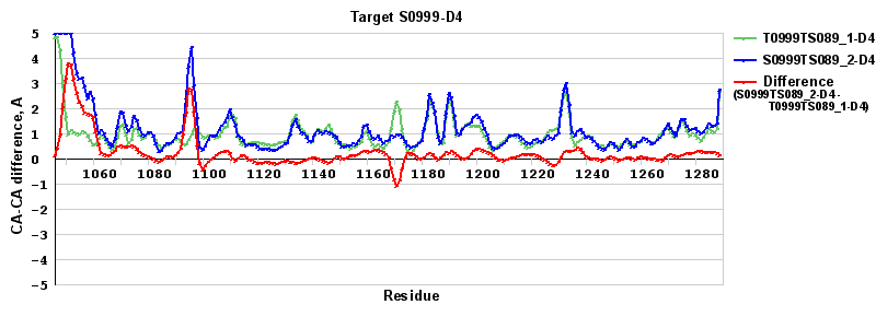 | Red line = (blue line) - (green thick line): difference between the corresponding "Assisted Model"-Target and "Regular Model"-Target CA-CA distances (see above). Negative values show regions where the "assisted" model has better fit to the target than the reference model, i.e. areas of potential improvement. |
