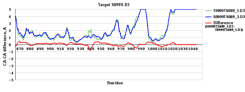 | Red line = (blue line) - (green thick line): difference between the corresponding "Assisted Model"-Target and "Regular Model"-Target CA-CA distances (see above). Negative values show regions where the "assisted" model has better fit to the target than the reference model, i.e. areas of potential improvement. |
