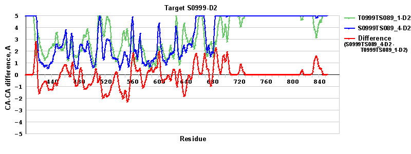 | Red line = (blue line) - (green thick line): difference between the corresponding "Assisted Model"-Target and "Regular Model"-Target CA-CA distances (see above). Negative values show regions where the "assisted" model has better fit to the target than the reference model, i.e. areas of potential improvement. |