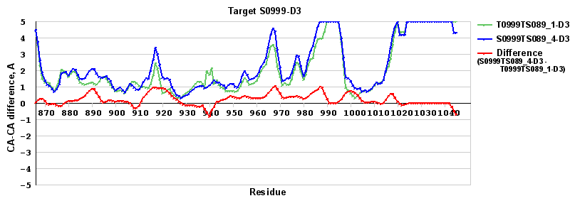 Red line = (blue line) - (green thick line): difference between the corresponding "Assisted Model"-Target and "Regular Model"-Target CA-CA distances (see above). Negative values show regions where the "assisted" model has better fit to the target than the reference model, i.e. areas of potential improvement.