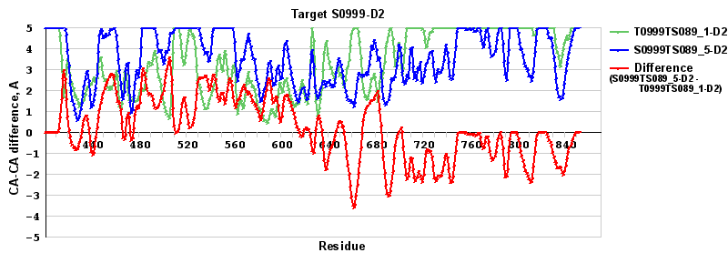 Red line = (blue line) - (green thick line): difference between the corresponding "Assisted Model"-Target and "Regular Model"-Target CA-CA distances (see above). Negative values show regions where the "assisted" model has better fit to the target than the reference model, i.e. areas of potential improvement.