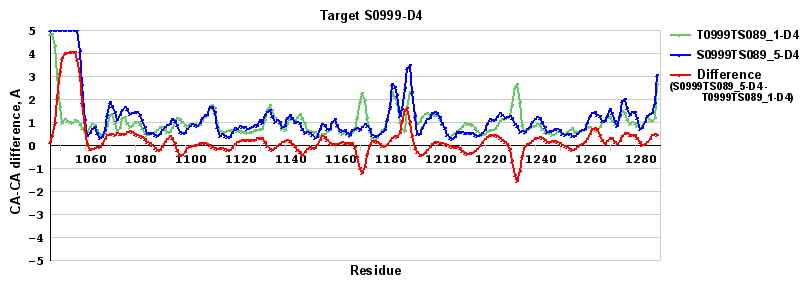 Red line = (blue line) - (green thick line): difference between the corresponding "Assisted Model"-Target and "Regular Model"-Target CA-CA distances (see above). Negative values show regions where the "assisted" model has better fit to the target than the reference model, i.e. areas of potential improvement.