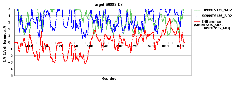 | Red line = (blue line) - (green thick line): difference between the corresponding "Assisted Model"-Target and "Regular Model"-Target CA-CA distances (see above). Negative values show regions where the "assisted" model has better fit to the target than the reference model, i.e. areas of potential improvement. |