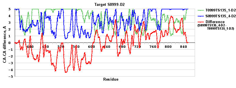 | Red line = (blue line) - (green thick line): difference between the corresponding "Assisted Model"-Target and "Regular Model"-Target CA-CA distances (see above). Negative values show regions where the "assisted" model has better fit to the target than the reference model, i.e. areas of potential improvement. |