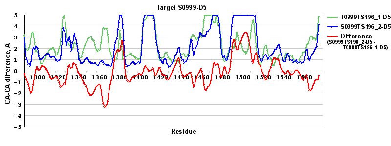 Red line = (blue line) - (green thick line): difference between the corresponding "Assisted Model"-Target and "Regular Model"-Target CA-CA distances (see above). Negative values show regions where the "assisted" model has better fit to the target than the reference model, i.e. areas of potential improvement.