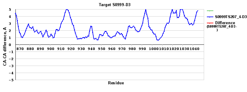 | Red line = (blue line) - (green thick line): difference between the corresponding "Assisted Model"-Target and "Regular Model"-Target CA-CA distances (see above). Negative values show regions where the "assisted" model has better fit to the target than the reference model, i.e. areas of potential improvement. |