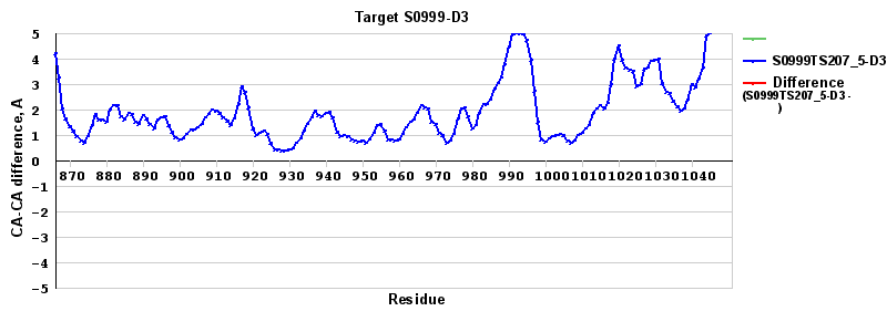 Red line = (blue line) - (green thick line): difference between the corresponding "Assisted Model"-Target and "Regular Model"-Target CA-CA distances (see above). Negative values show regions where the "assisted" model has better fit to the target than the reference model, i.e. areas of potential improvement.