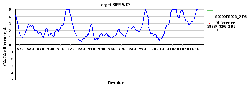 Red line = (blue line) - (green thick line): difference between the corresponding "Assisted Model"-Target and "Regular Model"-Target CA-CA distances (see above). Negative values show regions where the "assisted" model has better fit to the target than the reference model, i.e. areas of potential improvement.