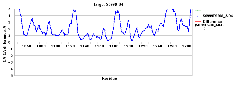 | Blue line: distance between the corresponding CA atoms in a "assisted model" and the experimental structure in the LGA sequence-independent superposition under the 4A distance cutoff. |