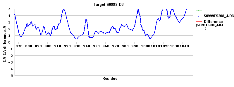 Red line = (blue line) - (green thick line): difference between the corresponding "Assisted Model"-Target and "Regular Model"-Target CA-CA distances (see above). Negative values show regions where the "assisted" model has better fit to the target than the reference model, i.e. areas of potential improvement.