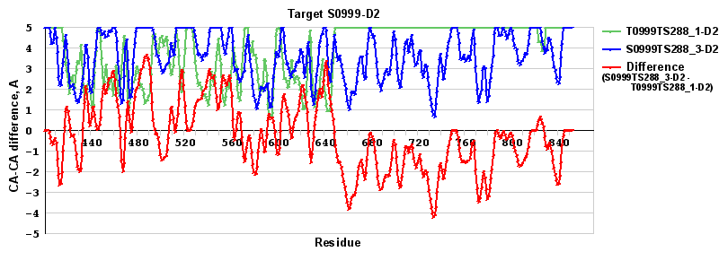 Red line = (blue line) - (green thick line): difference between the corresponding "Assisted Model"-Target and "Regular Model"-Target CA-CA distances (see above). Negative values show regions where the "assisted" model has better fit to the target than the reference model, i.e. areas of potential improvement.