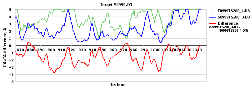 Red line = (blue line) - (green thick line): difference between the corresponding "Assisted Model"-Target and "Regular Model"-Target CA-CA distances (see above). Negative values show regions where the "assisted" model has better fit to the target than the reference model, i.e. areas of potential improvement.