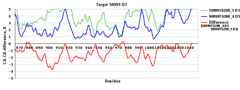 | Red line = (blue line) - (green thick line): difference between the corresponding "Assisted Model"-Target and "Regular Model"-Target CA-CA distances (see above). Negative values show regions where the "assisted" model has better fit to the target than the reference model, i.e. areas of potential improvement. |