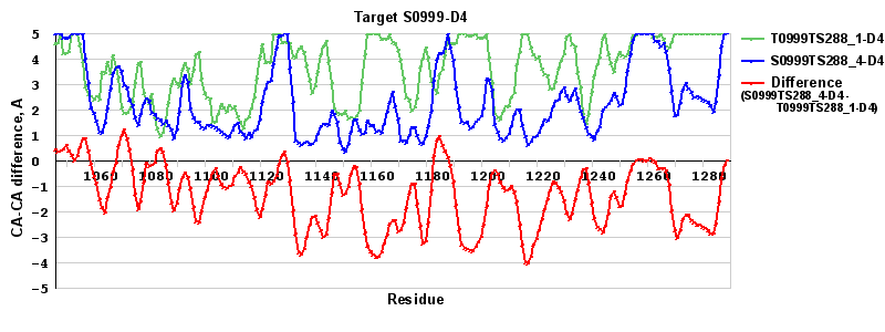 | Red line = (blue line) - (green thick line): difference between the corresponding "Assisted Model"-Target and "Regular Model"-Target CA-CA distances (see above). Negative values show regions where the "assisted" model has better fit to the target than the reference model, i.e. areas of potential improvement. |