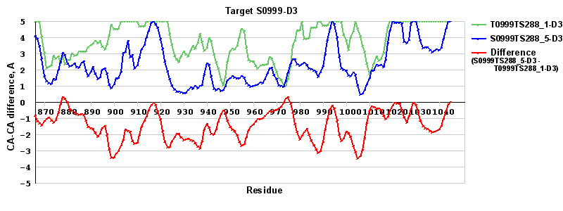 | Red line = (blue line) - (green thick line): difference between the corresponding "Assisted Model"-Target and "Regular Model"-Target CA-CA distances (see above). Negative values show regions where the "assisted" model has better fit to the target than the reference model, i.e. areas of potential improvement. |