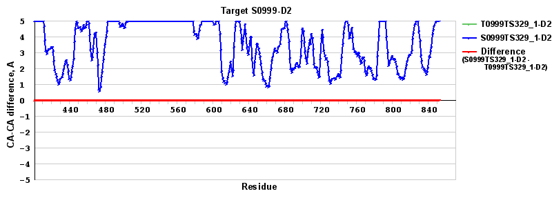 | Red line = (blue line) - (green thick line): difference between the corresponding "Assisted Model"-Target and "Regular Model"-Target CA-CA distances (see above). Negative values show regions where the "assisted" model has better fit to the target than the reference model, i.e. areas of potential improvement. |