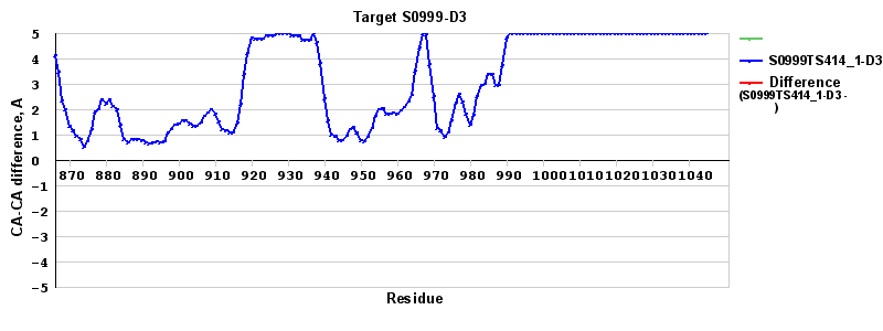 Red line = (blue line) - (green thick line): difference between the corresponding "Assisted Model"-Target and "Regular Model"-Target CA-CA distances (see above). Negative values show regions where the "assisted" model has better fit to the target than the reference model, i.e. areas of potential improvement.