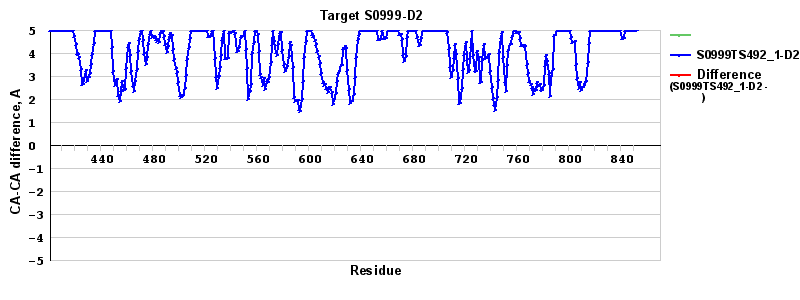 Red line = (blue line) - (green thick line): difference between the corresponding "Assisted Model"-Target and "Regular Model"-Target CA-CA distances (see above). Negative values show regions where the "assisted" model has better fit to the target than the reference model, i.e. areas of potential improvement.