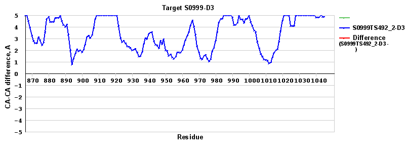 | Red line = (blue line) - (green thick line): difference between the corresponding "Assisted Model"-Target and "Regular Model"-Target CA-CA distances (see above). Negative values show regions where the "assisted" model has better fit to the target than the reference model, i.e. areas of potential improvement. |
