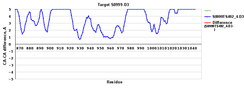 | Red line = (blue line) - (green thick line): difference between the corresponding "Assisted Model"-Target and "Regular Model"-Target CA-CA distances (see above). Negative values show regions where the "assisted" model has better fit to the target than the reference model, i.e. areas of potential improvement. |