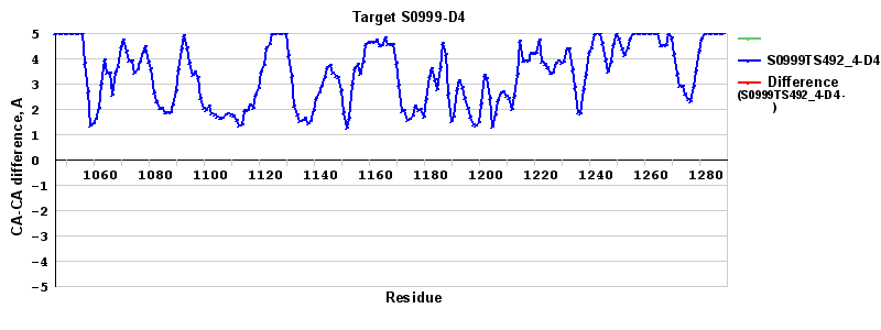 Red line = (blue line) - (green thick line): difference between the corresponding "Assisted Model"-Target and "Regular Model"-Target CA-CA distances (see above). Negative values show regions where the "assisted" model has better fit to the target than the reference model, i.e. areas of potential improvement.
