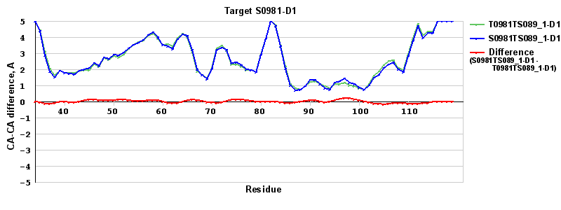 | Red line = (blue line) - (green thick line): difference between the corresponding "Assisted Model"-Target and "Regular Model"-Target CA-CA distances (see above). Negative values show regions where the "assisted" model has better fit to the target than the reference model, i.e. areas of potential improvement. |