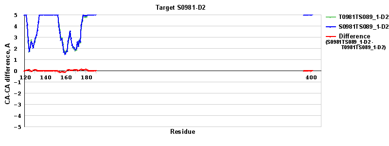 | Red line = (blue line) - (green thick line): difference between the corresponding "Assisted Model"-Target and "Regular Model"-Target CA-CA distances (see above). Negative values show regions where the "assisted" model has better fit to the target than the reference model, i.e. areas of potential improvement. |