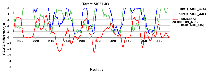 Red line = (blue line) - (green thick line): difference between the corresponding "Assisted Model"-Target and "Regular Model"-Target CA-CA distances (see above). Negative values show regions where the "assisted" model has better fit to the target than the reference model, i.e. areas of potential improvement.