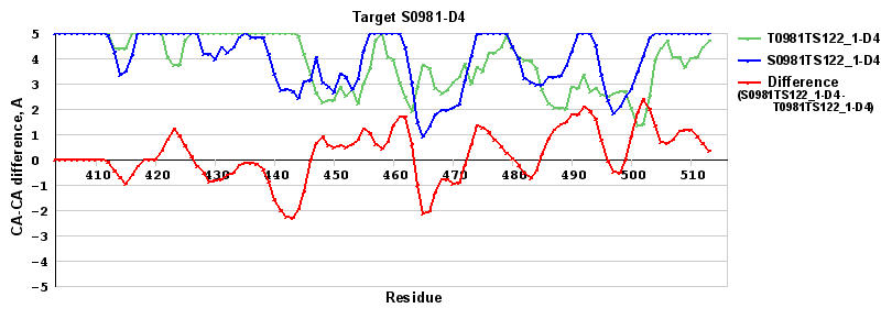 | Red line = (blue line) - (green thick line): difference between the corresponding "Assisted Model"-Target and "Regular Model"-Target CA-CA distances (see above). Negative values show regions where the "assisted" model has better fit to the target than the reference model, i.e. areas of potential improvement. |