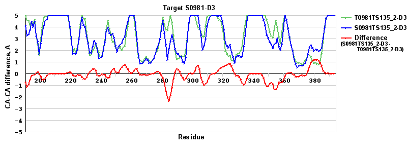 | Red line = (blue line) - (green thick line): difference between the corresponding "Assisted Model"-Target and "Regular Model"-Target CA-CA distances (see above). Negative values show regions where the "assisted" model has better fit to the target than the reference model, i.e. areas of potential improvement. |