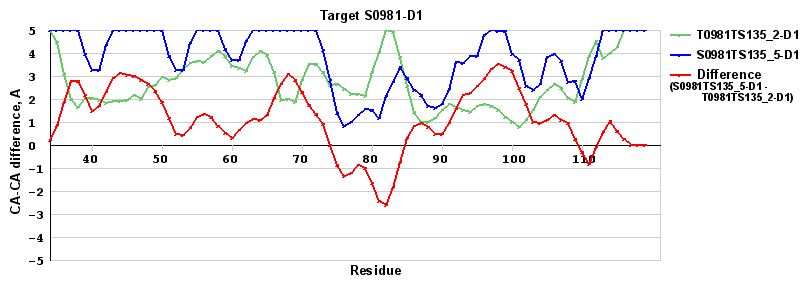 Red line = (blue line) - (green thick line): difference between the corresponding "Assisted Model"-Target and "Regular Model"-Target CA-CA distances (see above). Negative values show regions where the "assisted" model has better fit to the target than the reference model, i.e. areas of potential improvement.