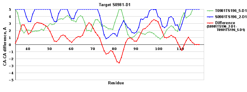 Red line = (blue line) - (green thick line): difference between the corresponding "Assisted Model"-Target and "Regular Model"-Target CA-CA distances (see above). Negative values show regions where the "assisted" model has better fit to the target than the reference model, i.e. areas of potential improvement.