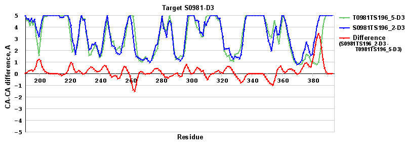 | Red line = (blue line) - (green thick line): difference between the corresponding "Assisted Model"-Target and "Regular Model"-Target CA-CA distances (see above). Negative values show regions where the "assisted" model has better fit to the target than the reference model, i.e. areas of potential improvement. |