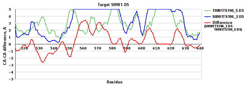 | Red line = (blue line) - (green thick line): difference between the corresponding "Assisted Model"-Target and "Regular Model"-Target CA-CA distances (see above). Negative values show regions where the "assisted" model has better fit to the target than the reference model, i.e. areas of potential improvement. |