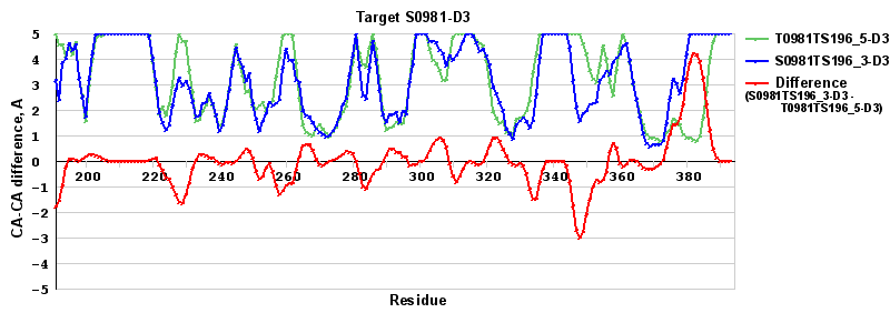| Red line = (blue line) - (green thick line): difference between the corresponding "Assisted Model"-Target and "Regular Model"-Target CA-CA distances (see above). Negative values show regions where the "assisted" model has better fit to the target than the reference model, i.e. areas of potential improvement. |