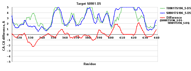 | Red line = (blue line) - (green thick line): difference between the corresponding "Assisted Model"-Target and "Regular Model"-Target CA-CA distances (see above). Negative values show regions where the "assisted" model has better fit to the target than the reference model, i.e. areas of potential improvement. |