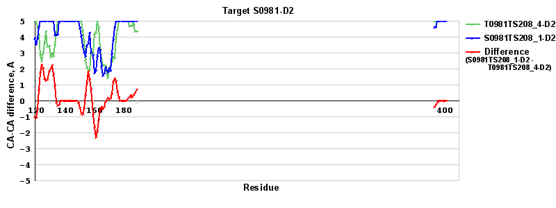 | Red line = (blue line) - (green thick line): difference between the corresponding "Assisted Model"-Target and "Regular Model"-Target CA-CA distances (see above). Negative values show regions where the "assisted" model has better fit to the target than the reference model, i.e. areas of potential improvement. |