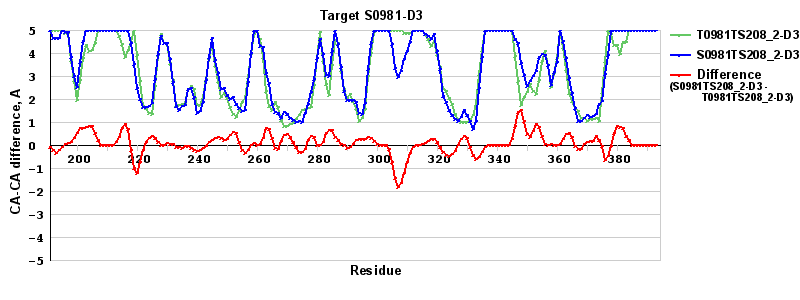 | Red line = (blue line) - (green thick line): difference between the corresponding "Assisted Model"-Target and "Regular Model"-Target CA-CA distances (see above). Negative values show regions where the "assisted" model has better fit to the target than the reference model, i.e. areas of potential improvement. |