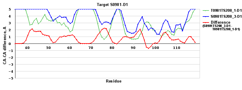 Red line = (blue line) - (green thick line): difference between the corresponding "Assisted Model"-Target and "Regular Model"-Target CA-CA distances (see above). Negative values show regions where the "assisted" model has better fit to the target than the reference model, i.e. areas of potential improvement.