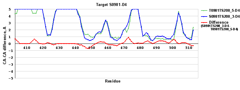 | Red line = (blue line) - (green thick line): difference between the corresponding "Assisted Model"-Target and "Regular Model"-Target CA-CA distances (see above). Negative values show regions where the "assisted" model has better fit to the target than the reference model, i.e. areas of potential improvement. |